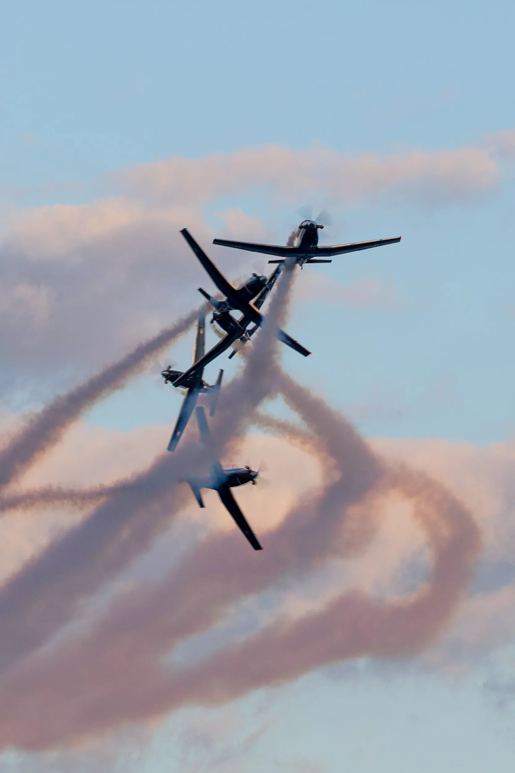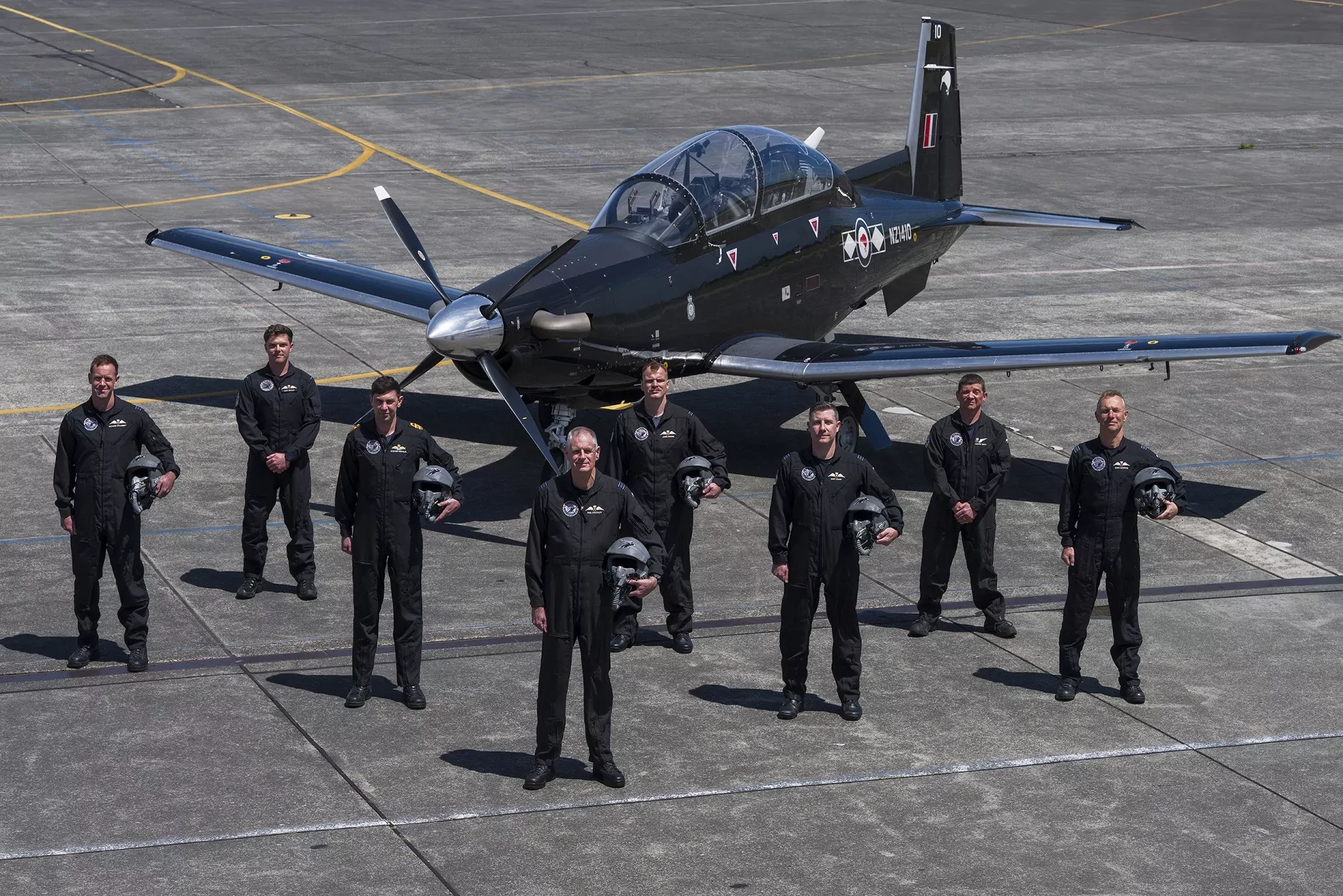 The Black Falcons team was formed in 2015 when the RNZAF took delivery of the Texan II T 6C trainer aircraft, with the five aircraft aerobatic team created shortly after.