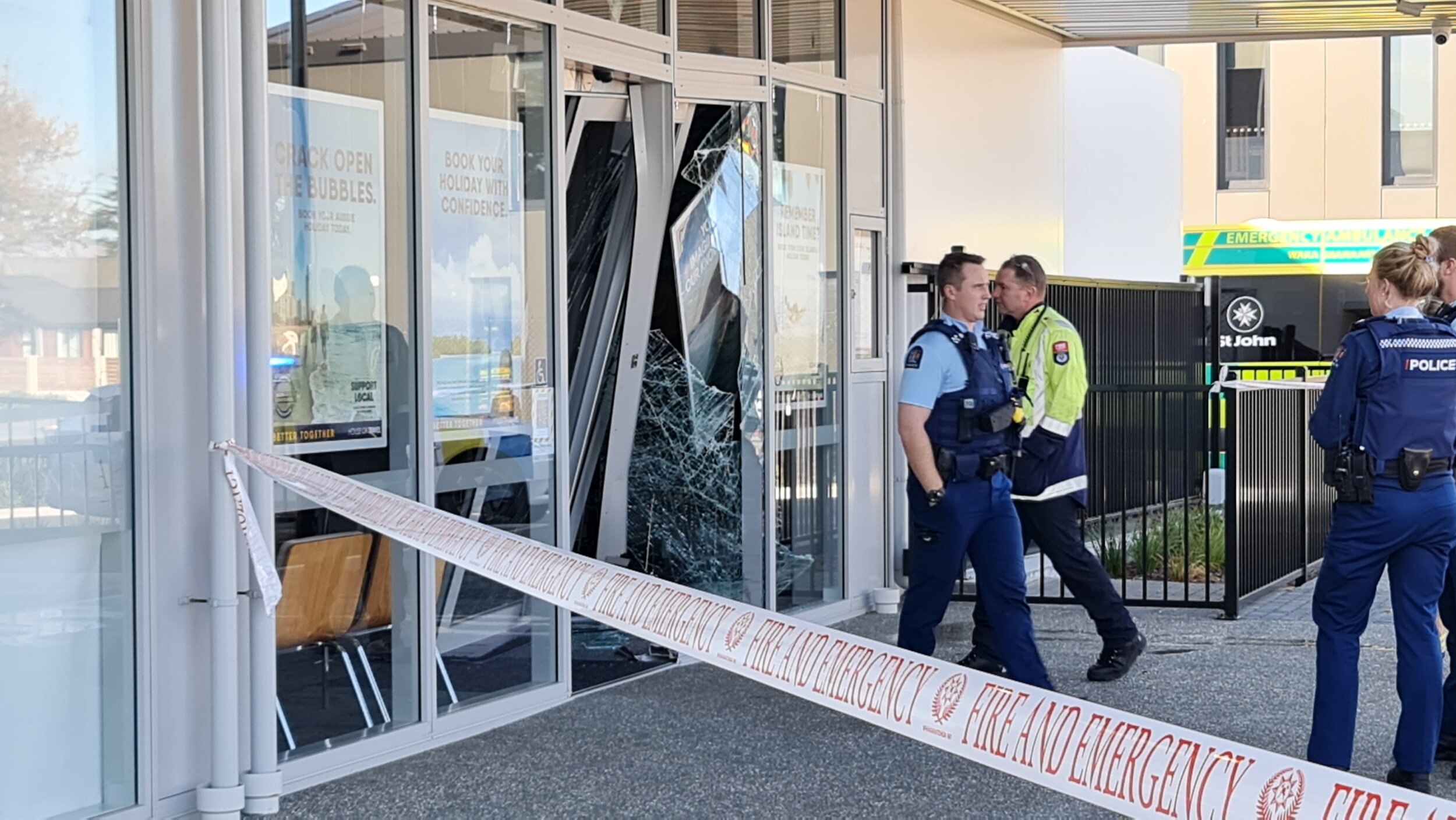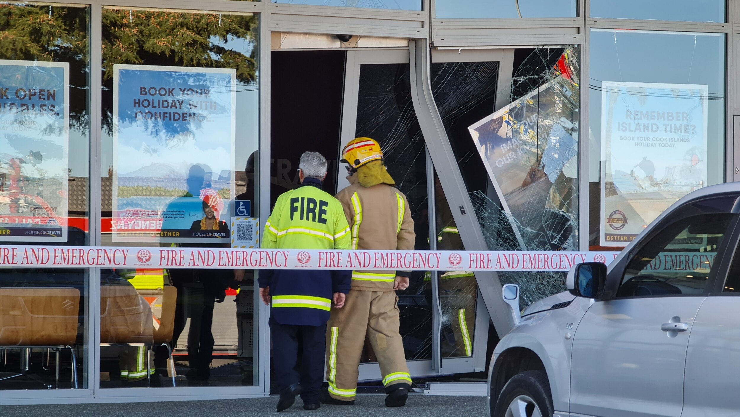 A car has smashed right through the glass doors of House of Travel in Papanui.