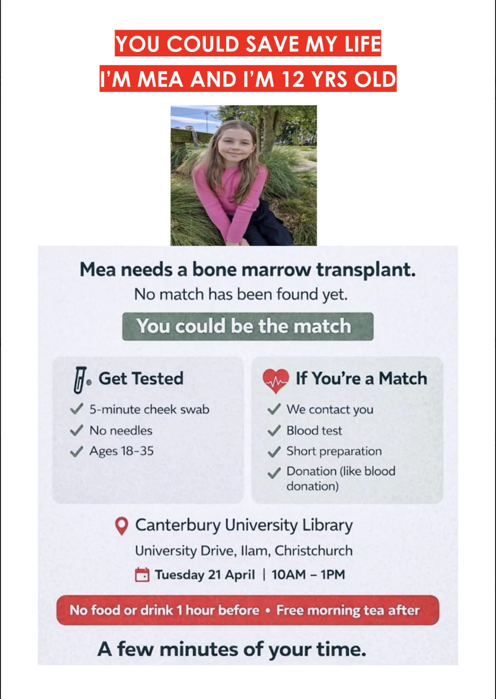 If You’re a Match We contact you Blood test Short preparation Donation (like blood donation) Canterbury University Library, University Drive, Ilam, Christchurch Tuesday 21 April | 10AM – 1PM No food or drink 1 hour before • Free morning tea after A few minutes of your time.
