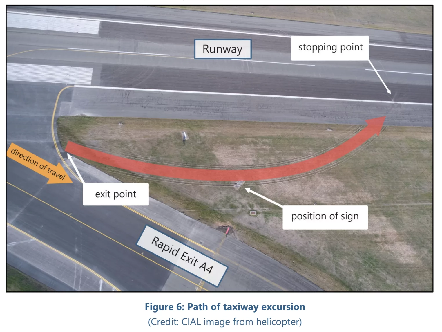 It veered off the taxiway, struck an airfield sign, and travelled across grass before coming to a stop back on the runway.