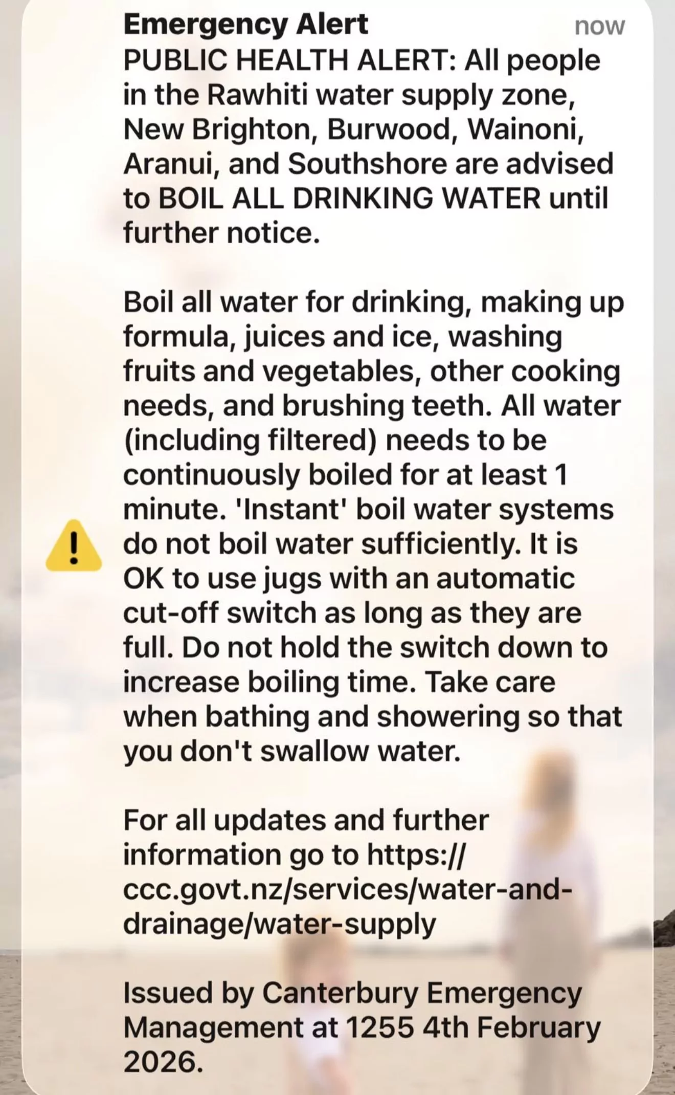 The alert said, “PUBLIC HEALTH ALERT: All people in the Rawhiti water supply zone, New Brighton, Burwood, Wainoni, Aranui, and Southshore are advised to BOIL ALL DRINKING WATER until further notice.”