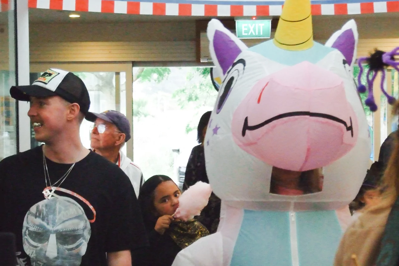 Children and adults played carnival-style games, enjoyed inflatables and a mechanical surfboard, listened to performances by local youth bands, sampled food from various trucks, and took home some of the 30 kilograms of lollies that were handed out.