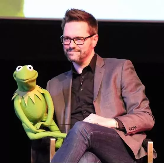 Puppeteer Matt Vogel with Kermit the Frog at a television convention.
