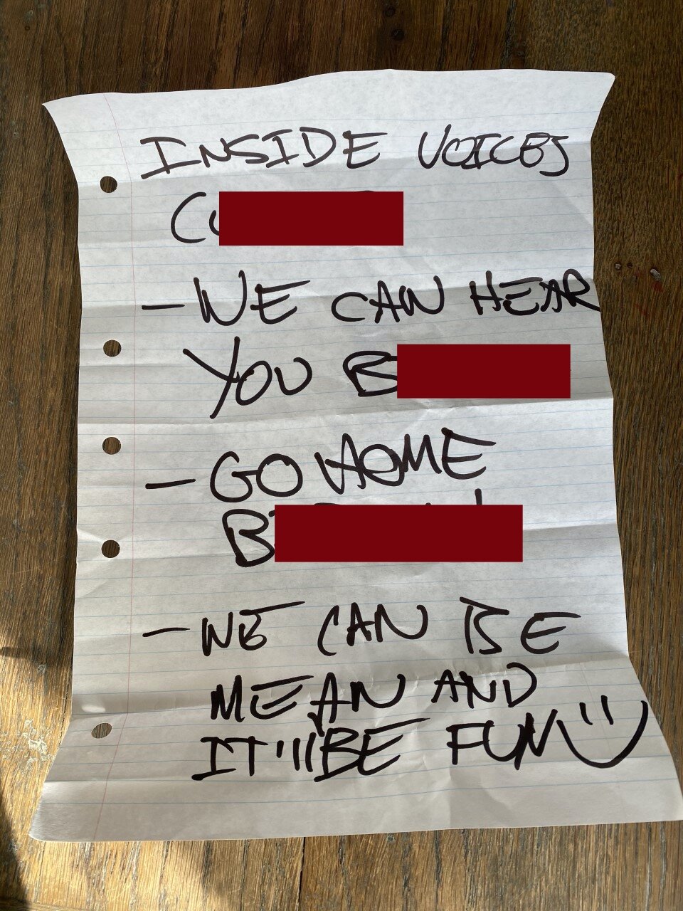 The note said “inside voices c***s – we can hear you b***h – go home b***h – we can be mean and it’ll be fun.”