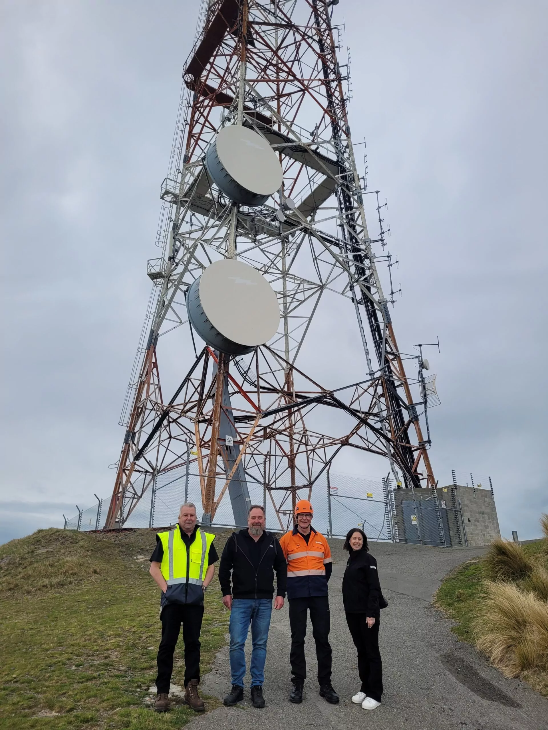 Neil Livingston (CEO – Kordia), Phil Shaw (Christchurch Field Team Leader – Kordia), Andrew Glue, and Jennifer Johnson (Head of Brand and Marketing – Kordia) at the Sugarloaf tower.