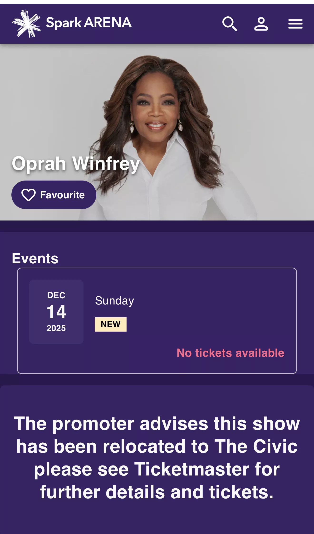 Oprah Winfrey’s Auckland appearance has been quietly moved from Spark Arena to the much smaller Civic Theatre, suggesting weaker than expected ticket sales for the talk show host’s one night only event.