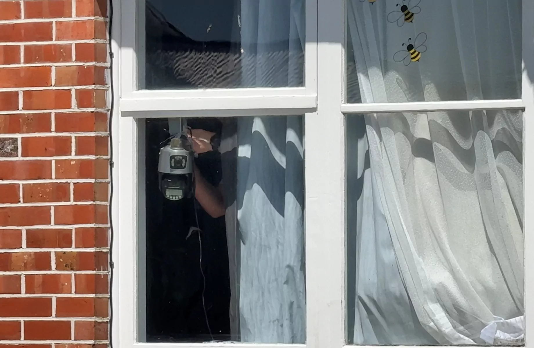 Officers appeared to remove video surveillance camera, which had been taped to a window.