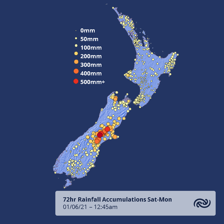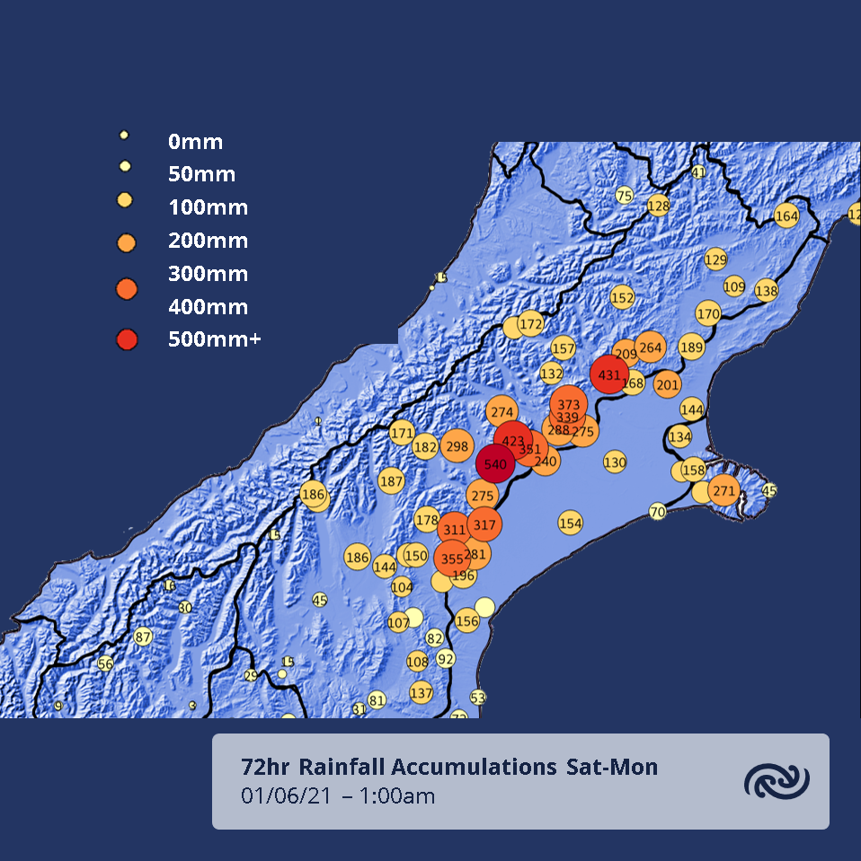 In a 72 hour period between midnight Friday and midnight Monday, Environment Canterbury rain gauge at Mt Somers totaled 540mm – more than nearby Oamaru gets in a typical year, or about the same as notoriously wet Milford Sound gets in an average winter month.