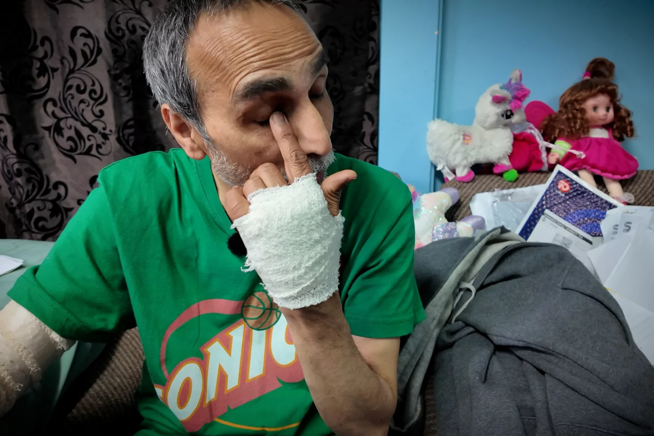 Kamlesh Patel pointing to his injured eye, with stitches.